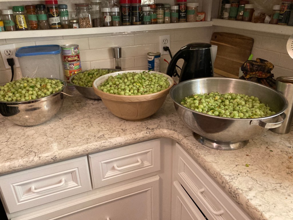 Yup, those are big bowls – 21 quarts of gooseberries from our 3 bushes harvested this year. Last year was only 8 quarts – so we gave 2 quarts to a neighbour to make jam, made a batch of jam ourselves, ground some up to make yoghurt-gooseberry popsicles (I love them!) and put the rest, whole, in freezer bags of the correct size to make pie filling. This was after spending hours topping and tailing them! But so worth it.
