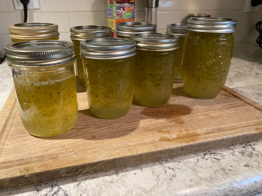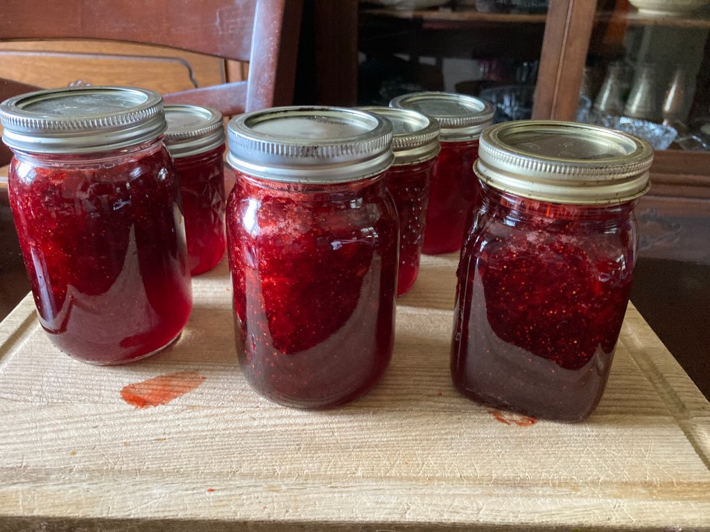 I started this a couple of weeks ago, and, as predicted, immediately got go-go-go harvesting. We now have been picking blueberries – making jam and putting several quarts into the freezer (just put in container and freeze: wash as they come out and you are good to go) for our grandson’s favourite: Grampa’s waffles with maple syrup and blueberries – one in each square! We hit our local roadside stand when our raspberries failed in the dry and heat so we have some raspberries in the freezer. We also picked up half a bushel of #2 cucumbers and made 16 quarts of dill pickles and picked up 15 lbs of carrots and made GG’s Dilled Carrots that we love. The shelves in the “cold room” under the front porch are filling up!