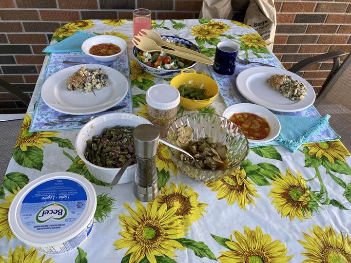 We are now eating primarily from the garden. The photo above shows zucchini casserole with zucchini, dill, parsley and green onions from the garden; salad with lettuces, arugula, peppers, broccoli, tomatoes that were home grown; parmesan bean salad using our beans and onions; spicy cucumber salad; stewed tomatoes and peas from our garden. The salad dressing is blue cheese – homemade. We can sure tell at this time of year that it is August. Yesterday was local corn on the cob after we put the corn from 4 dozen cobs in the freezer and peach custard pie from local peaches after canning 20 quarts. My cold room overfloweth.