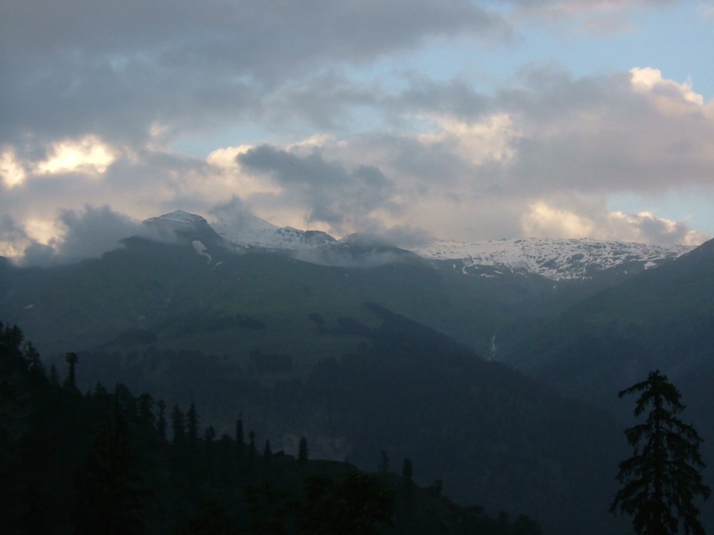 So, having a week’s leave, we headed off up the Kullu Valley. The first day we pretty well followed the Beas River and were heading to a town where Sahib and P and S had stayed. Unfortunately, we got thoroughly lost (despite having a pretty good set of maps). As dusk was falling we saw an empty meadow in deserted countryside across from a lonely gas station so we stopped and asked if it were possible to camp in the meadow. I am not sure they fully understood what we were asking but they said yes (okay, it was the Indian head wobble but we chose to identify it as permission!) so just as dusk was falling, we set up our tent, our small folding picnic table and our little propane burner with grill big enough to hold our pot and made supper before heading to bed for a very good night’s sleep. In the morning, we woke to the sounds of cows and, peering out of our tent, found them quite happily munching on what turned out to be marijuana plants in the meadow!