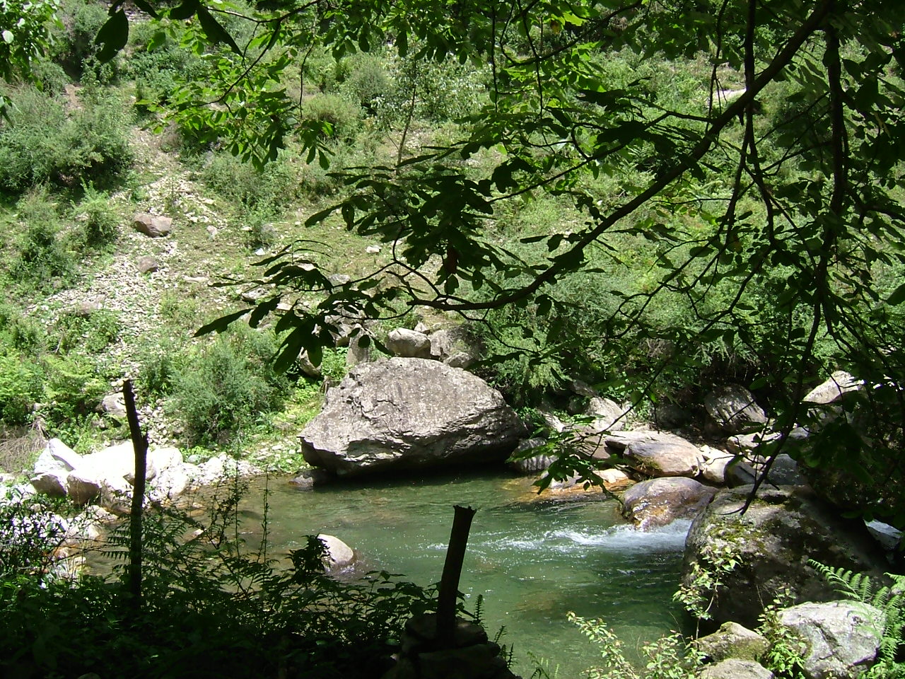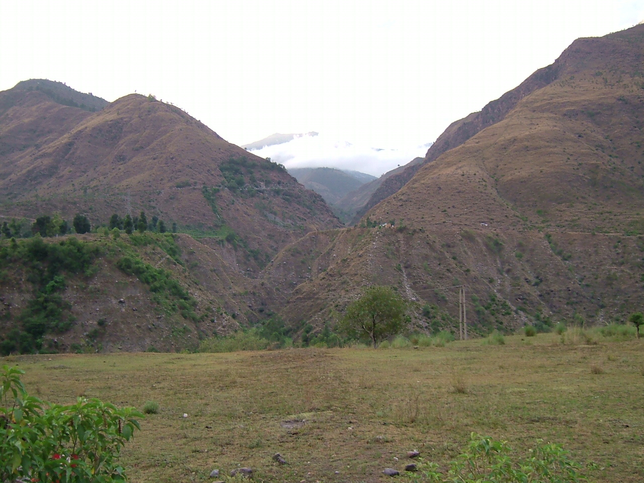 So, having a week’s leave, we headed off up the Kullu Valley. The first day we pretty well followed the Beas River and were heading to a town where Sahib and P and S had stayed. Unfortunately, we got thoroughly lost (despite having a pretty good set of maps). As dusk was falling we saw an empty meadow in deserted countryside across from a lonely gas station so we stopped and asked if it were possible to camp in the meadow. I am not sure they fully understood what we were asking but they said yes (okay, it was the Indian head wobble but we chose to identify it as permission!) so just as dusk was falling, we set up our tent, our small folding picnic table and our little propane burner with grill big enough to hold our pot and made supper before heading to bed for a very good night’s sleep. In the morning, we woke to the sounds of cows and, peering out of our tent, found them quite happily munching on what turned out to be marijuana plants in the meadow!