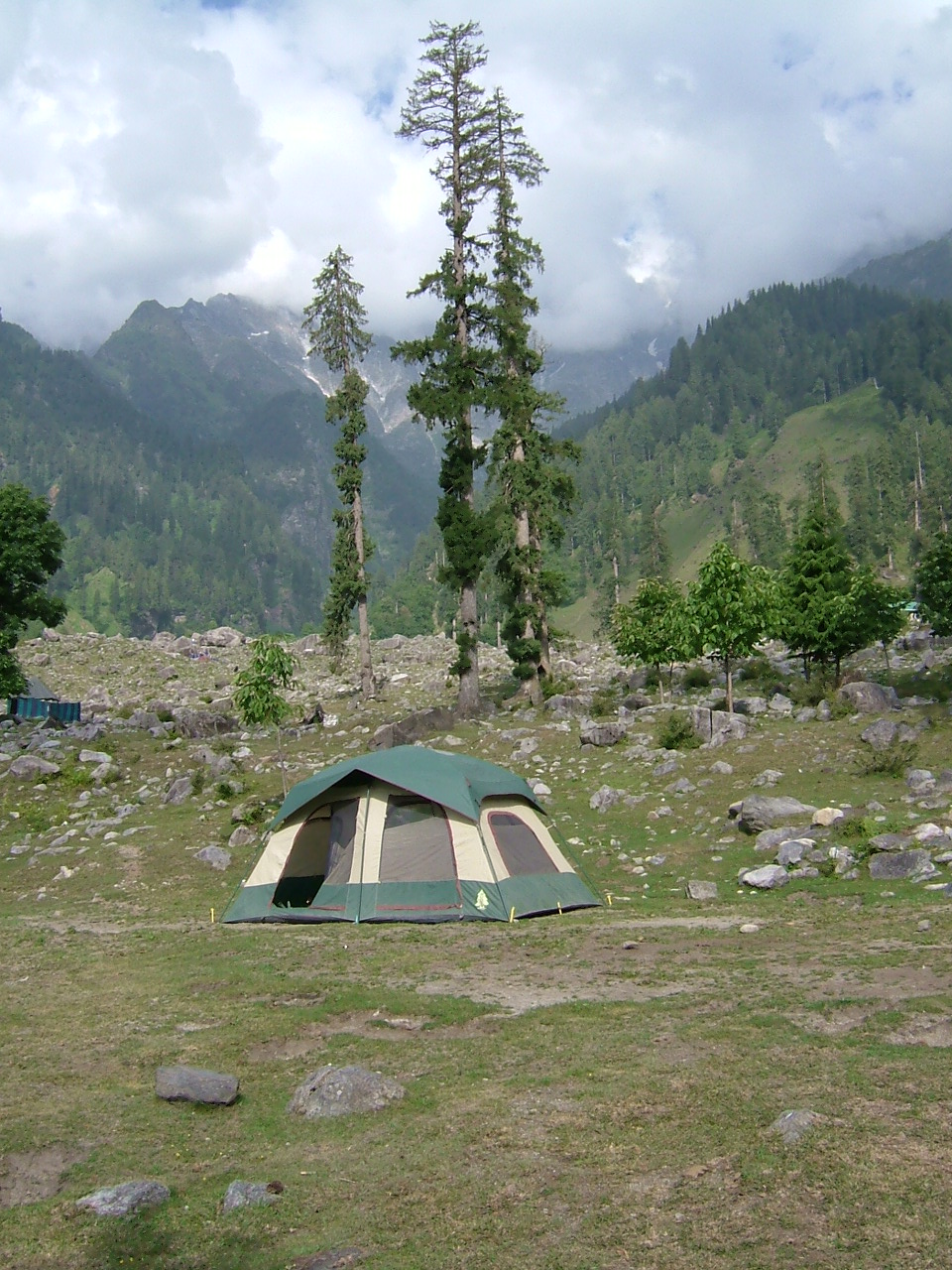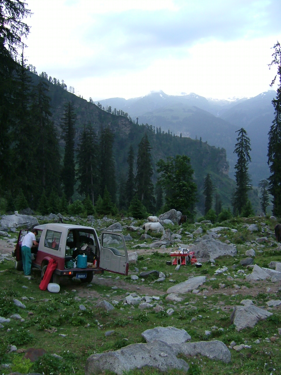 Onward we went to Manali – a real tourist hotspot being up in the hills and much cooler in June than the plains. It was crowded with tourists and, honestly, did not appeal to us. We were hoping to get a hotel room but did not really like what we saw so headed toward Rotang La in the hopes that Gypsy would take us up and over but, unfortunately, she was not keen on the altitude as we approached the pass. Seeing a large wooded and meadowed area, we approached the guard on the gate to see if we could camp on the meadow below a rocky field. Turns out, it was the Border Security Force’s training base and we were welcome to do so as long as we parked the car at the top and walked our stuff down. We actually kept our food in Gypsy (not knowing what animals were around) and only took the tent, sleeping bag and mattresses down – cooking and dining al fresco beside Gypsy!