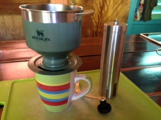 Stanley coffee filter and hand cranked coffee grinder – small enough to easily fit in my luggage!