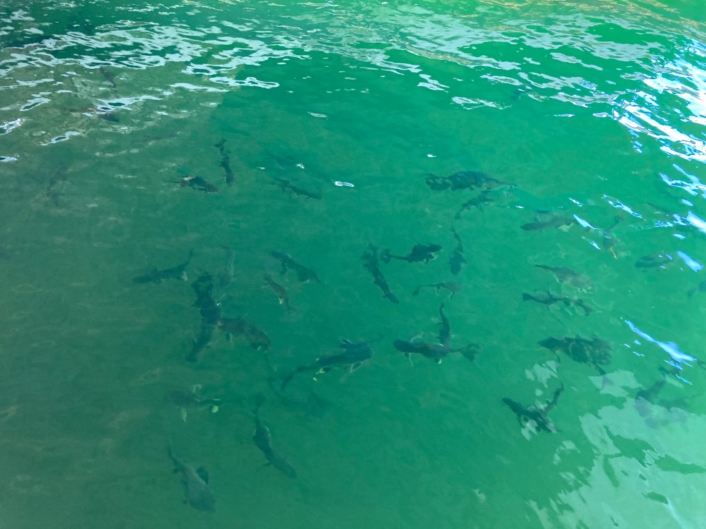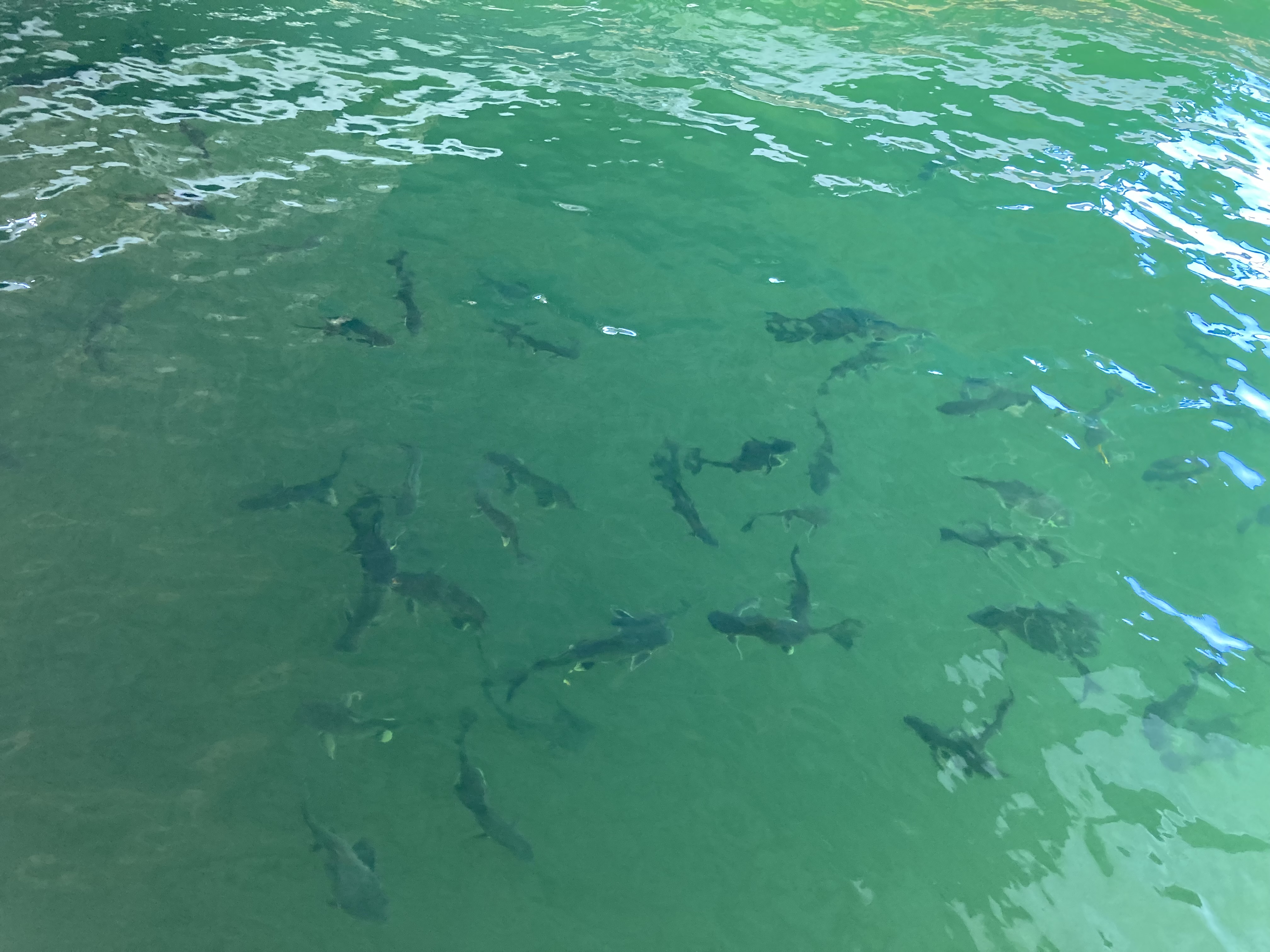 Between the two docks was this school of fish – looked like catfish about a foot long. I remember when I was in Osijek, Croatia, inviting a contact out to dinner that he recommended a restaurant in a curve on the Drava River where they had the “best smuć” as the local fish was called. Judging from the bones (and how very many of them there were) it was catfish by another name!